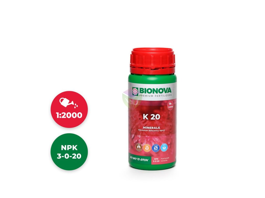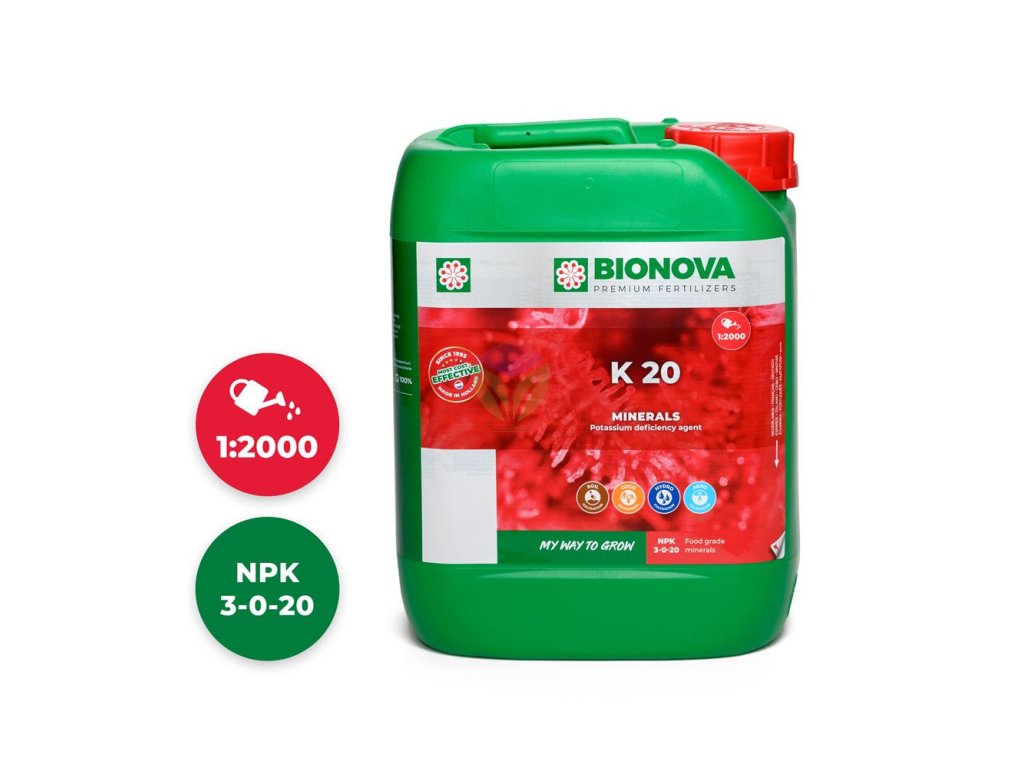 A 20 K-t káliumhiány esetén és/vagy a növények érettségének és szilárdságának javítására kell használni. A 20 K-t keverhetjük az összes Bionova műtrágyával, stimulátorokkal, ásványi anyagokkal, általános műtrágyákkal és szubsztrátumokkal. Használható öntözéshez is.