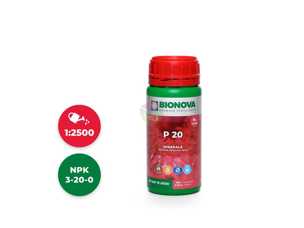 A P 20-at akkor kell használni, amikor foszforhiány lép fel vagy ha a virágzás kezdetét szeretnénk támogatni. A P 20 keverhető az összes Bionova műtrágyával, stimulátorral, ásványi anyaggal, univerzális műtrágyával és szubsztrátummal. A P 20 használható öntözéshez és levélpermetezéshez is.