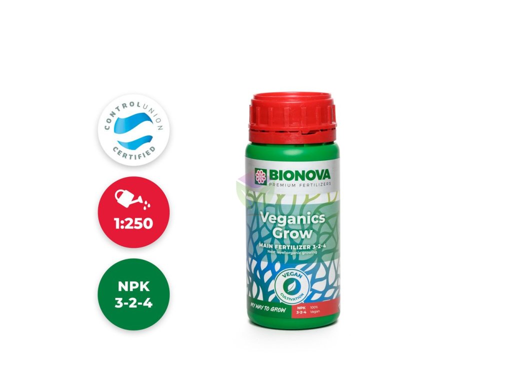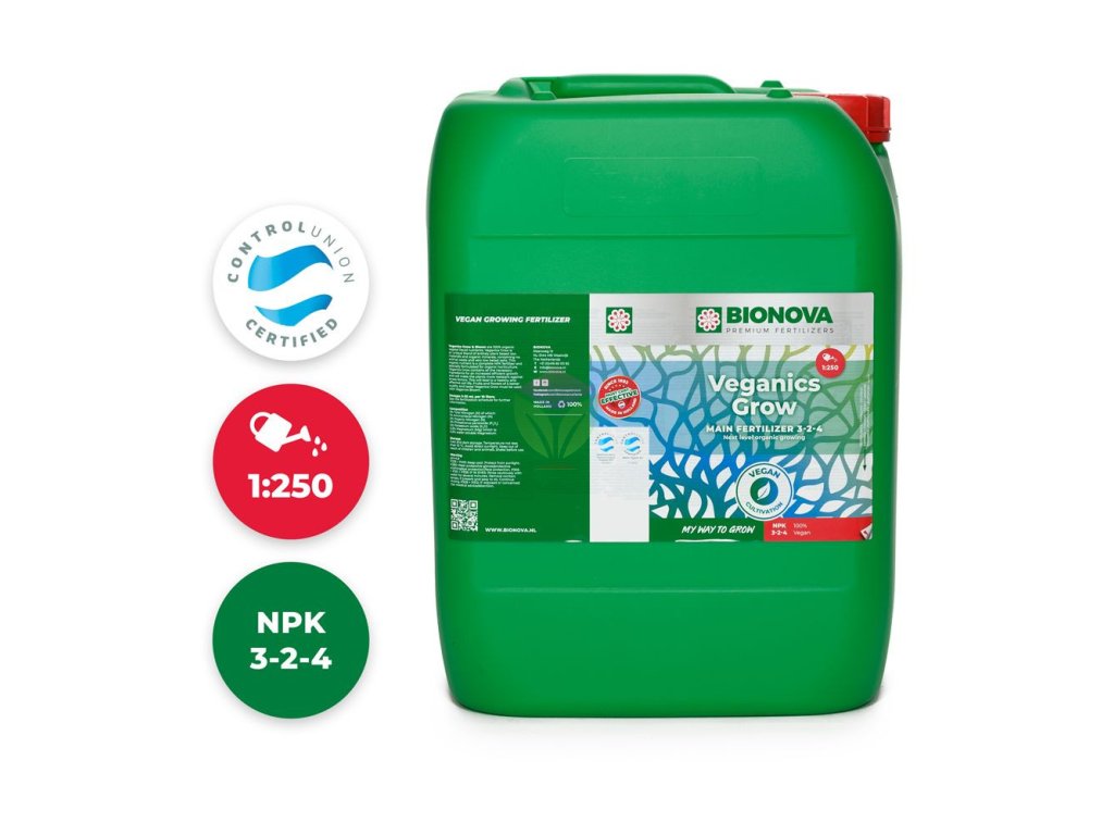 A Veganics Grow-t a növekedés első hetétől kezdve a betakarítás előtti hétig lehet alkalmazni. Öblítés szükséges. A Bionova Veganics Grow-t mindig a Veganics Bloom rendszerrel együtt kell használni, és kombinálható minden Vegan műtrággyával: Vegan PK 3-5, X-cel, The Missing Link és Roots. Használható öntözésként, de minden 2-3 naponta friss oldatot kell készíteni. Ha a felét adagoljuk, az oldat több hétig is elállhat.