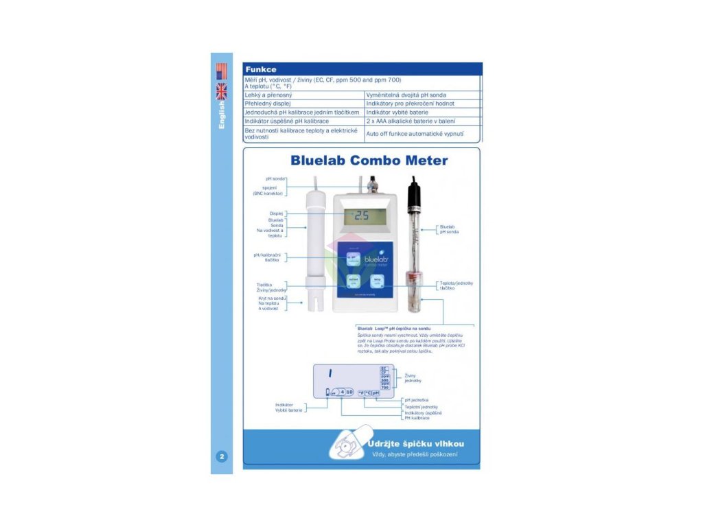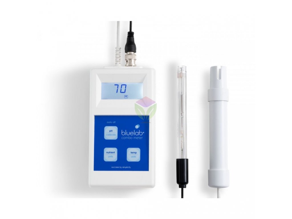 A Bluelab Combo Meter hordozható mérő három gombbal működik. A nagyméretű kijelzőn kívül két szondával rendelkezik. Az egyik a pH-t, a másik az EC-t és a hőmérsékletet méri. A méréshez egyszerűen helyezze a szondát a tápoldatba, és az eredmény megjelenik a monitoron. A pH-szonda kalibrálása egyszerű, a műszerrel együtt kap utasításokat, és egyetlen gombnyomással kalibrálhatja. A pH-szonda cserélhető, nem kell új műszert vásárolni.