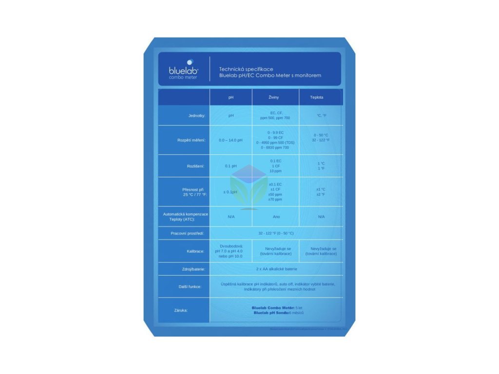 A hőmérséklet- és EC-szonda nem igényel kalibrálást, gyárilag előre be van állítva. A Bluelab Combo Meter 2xAAA elemekkel kerül forgalomba. Természetesen automatikus kikapcsolás üresjáratban. A mérőre öt év garancia vonatkozik a nem helytelen kezelésből eredő meghibásodásokra. A szondákra csak fél év garancia vonatkozik.