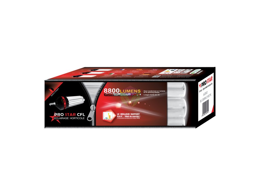 200W virágzásra szánt CFL izzó a Pro Star AGRO-tól, E40-es foglalattal és beépített előtéttel. Alacsonyabb hőmérséklet, mint az HPS-nek, ideális a virágzási szakaszhoz (2100 K).