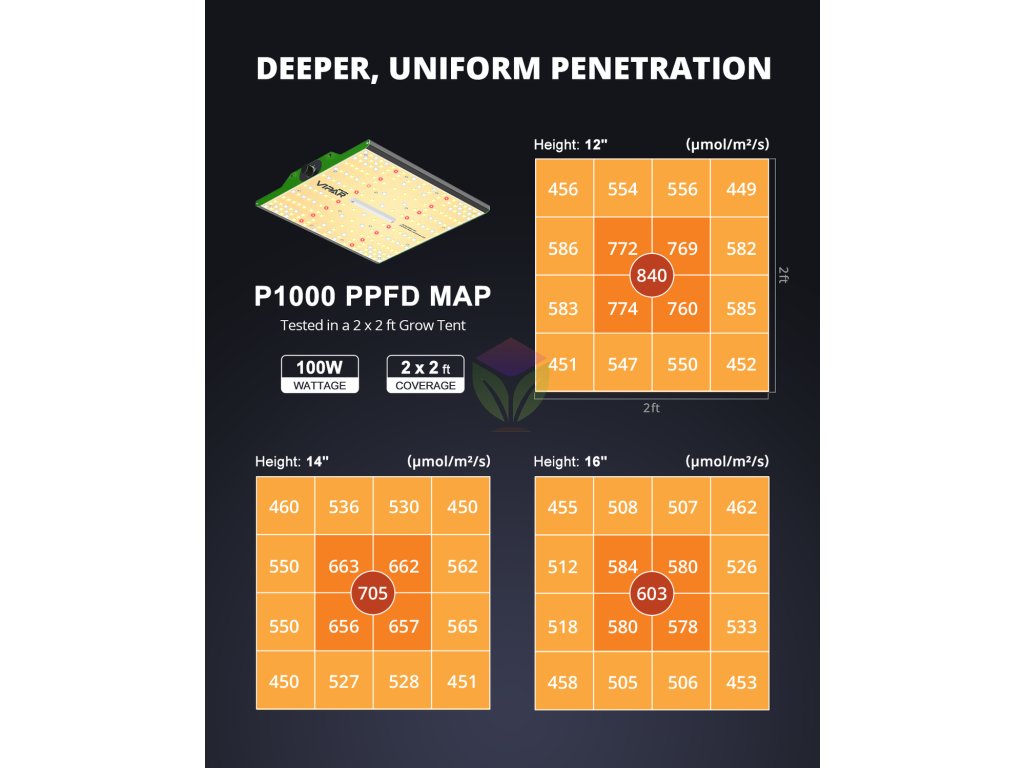 A ViparSpectra® P1000 100W teljesítményű LED növénytermesztő lámpa, mely 2023-ra tervezett, Samsung LM301B diódákkal és Daisy Chain funkcióval van felszerelve, amely akár 20 lámpa összekapcsolását teszi lehetővé - ez egy okos megoldás a kommersz nyári termesztéshez nagyobb terekben. A lámpa új diódakiosztást kínál az egyenletes világítás és mélyebb behatolás érdekében az árudaiba, ami növeli a teljes termést.