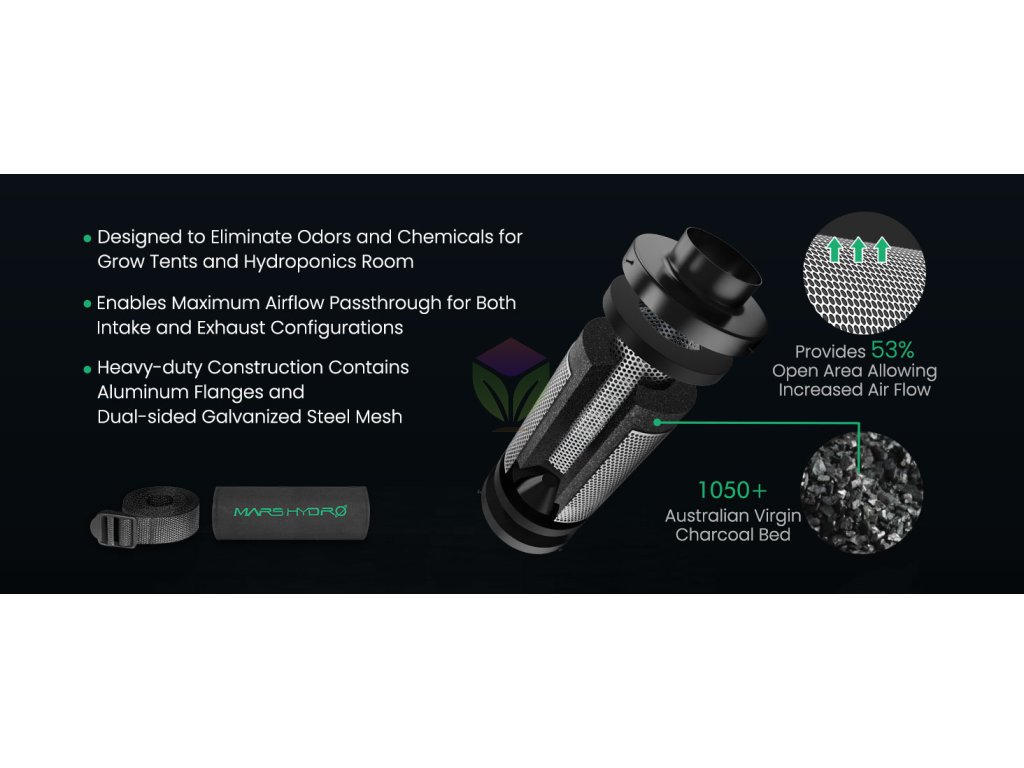 A Mars Hydro ventilátor biztosítja a hatékony légáramlást, míg a szénszűrő megakadályozza a szagok szivárgását, ezáltal egészséges környezetet teremt a növényei számára.