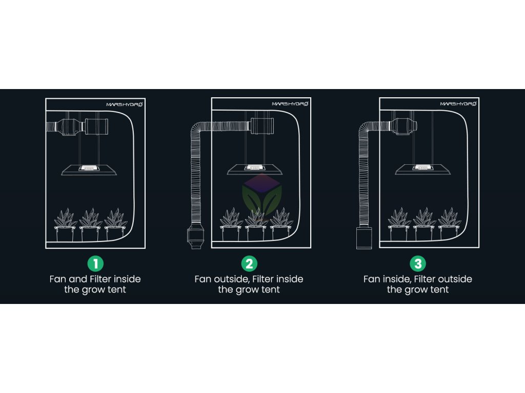A Mars Hydro ventilátor kevert áramlási kialakítással folyamatosan hozza a friss levegőt a termesztőhelyébe, percenként 2600 fordulattal és 500m3/h légszállítással. Csendes működésű, mindössze 26,8 dB zajszinttel, és minőségi ausztrál aktív szénszűrővel és 7,6 méter hosszú flexibilis csővezetékkel van ellátva.