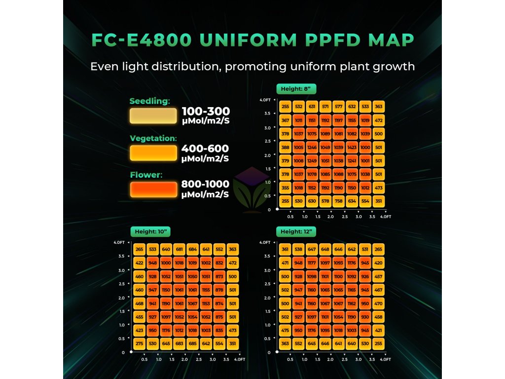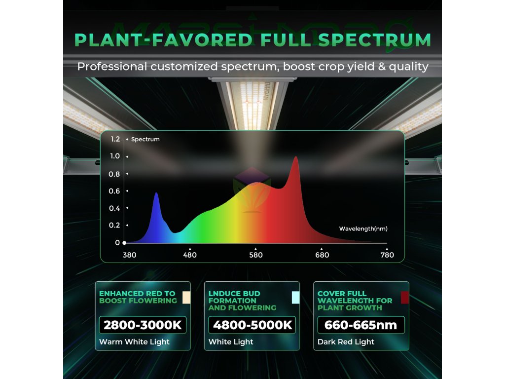 A Mars Hydro FC-E4800 modell BridgeLux diódákkal rendelkezik, amelyek a csúcsteljesítményű 2,8 µmol/J PPE hatékonyságot biztosítanak, 2,5g/watt maximális hozammal és 480 W teljesítménnyel. A kompakt design jobb terményminőséget biztosít és energiatakarékosabb.