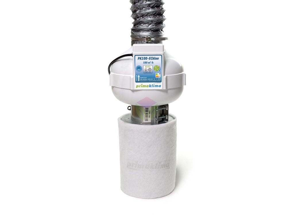 Prima Klima Ventilation PKVS PK-100-ECblue Szett, 580 m3/h, a szett tartalmazza a K2600-100 Eco Line szénszűrőt, a PK100-ECblue ventilátort és a könnyű csatlakoztatás szükséges kiegészítőit. A szűrő optimális áramlása 240 m3/h, míg a ventilátor teljesítménye elérheti az 580 m3/h-t. A szettet úgy tervezték, hogy hatékonyan távolítsa el a szagokat és port, valamint gyors telepítést biztosítson.
