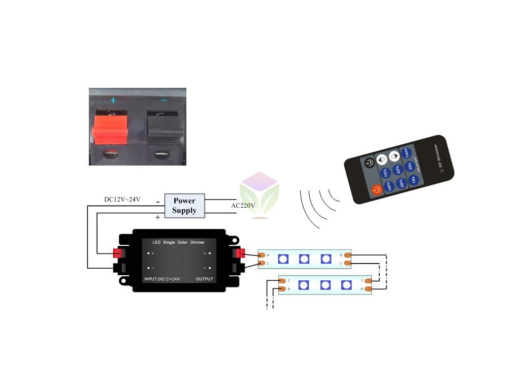 Dimmerul este compatibil cu 12-24V DC, cu o capacitate maximă de încărcare de 6A (<12V/72W, <24V/144W) și este conectat prin intermediul unui conector standard de joasă tensiune 2,1×5,5mm. Cu toate acestea, dacă acest conector este tăiat, produsul își va pierde garanția.