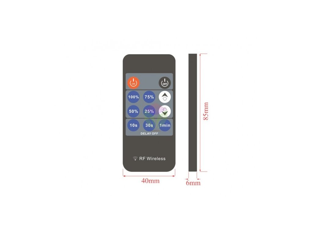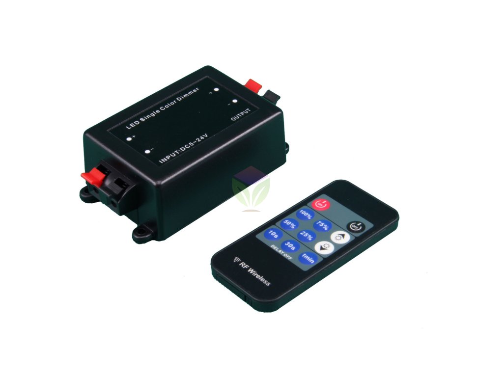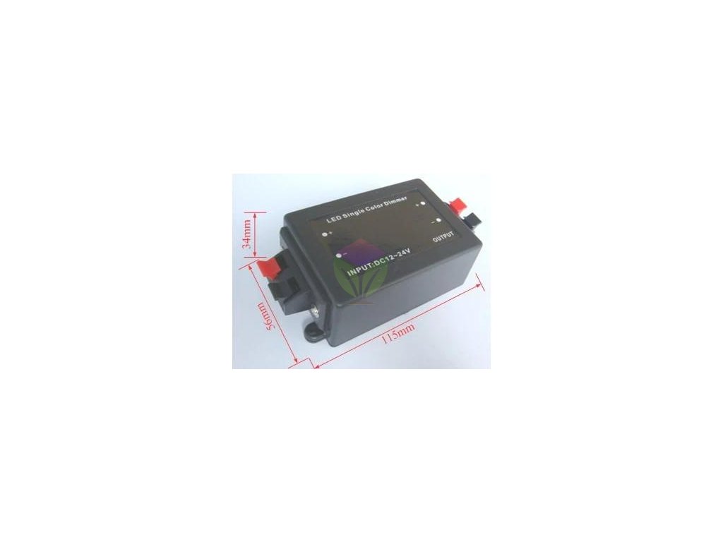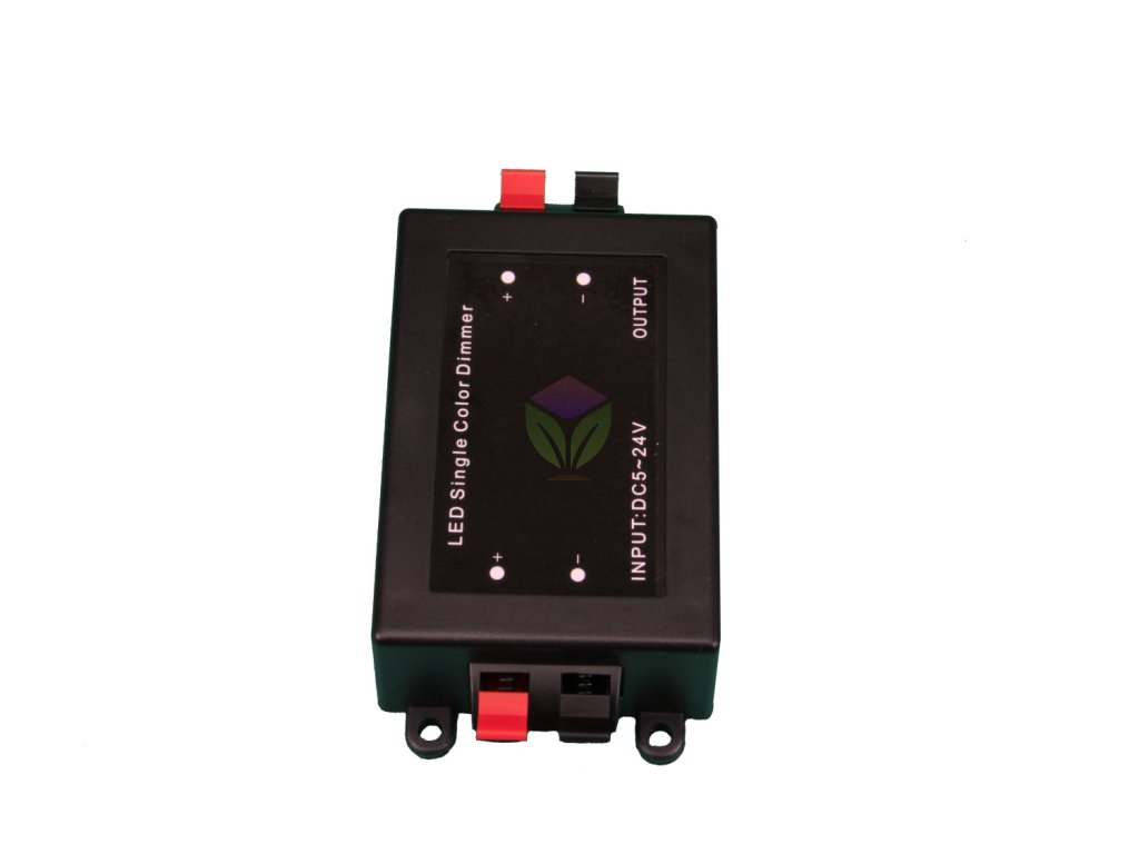 Dimmer manual cu un singur canal pentru controlul luminozității benzilor LED, becurilor LED de 12 V cu variator și modulelor monocrome. Unitatea dispune de control al luminozității de 0-100%, memorie pentru ultima setare și selecție a culorii alb sau negru. Sarcina maximă 6A, adecvat pentru 12-24V DC.