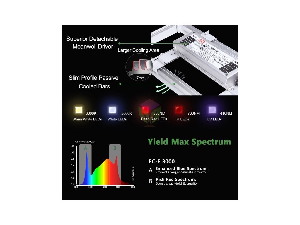 Mars Hydro FC-E4800 este înțesat cu cipuri BridgeLux care oferă un PPFD ridicat de până la 1200umol/m2/s, ceea ce reprezintă mai mult decât cantitatea ideală de lumină pentru cultivarea acasă într-un spațiu de 120 x 120 cm. În plus față de spectrul complet de lumină, adăugăm și lumină UV și IR pentru a satisface nevoile plantelor care cresc la niveluri mai ridicate.