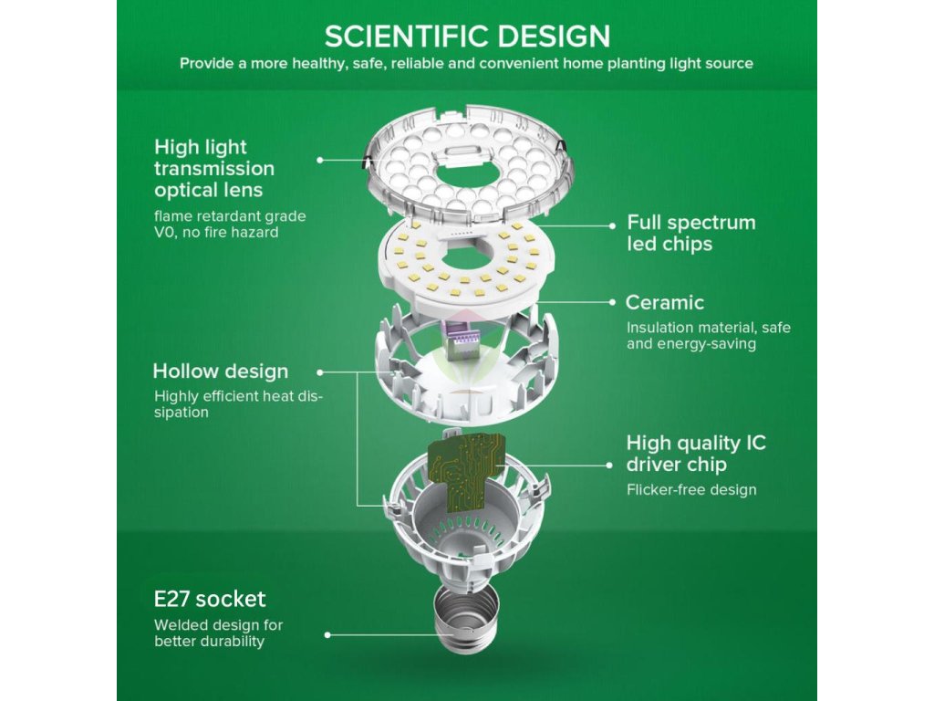 Încercați noua generație de becuri SANSI. Aceste becuri sunt considerate a fi cele mai bune de pe piață pentru creșterea plantelor, deoarece au spectru complet și valori PAR ridicate. Suportul ceramic al cipurilor LED asigură o durată lungă de viață a becului. Nu în ultimul rând, acest bec este rezistent la apă cu protecție IP65. Încercați-l și experimentați diferența față de lămpile cu sodiu sau lămpile LED "mai ieftine" din punct de vedere spectral.