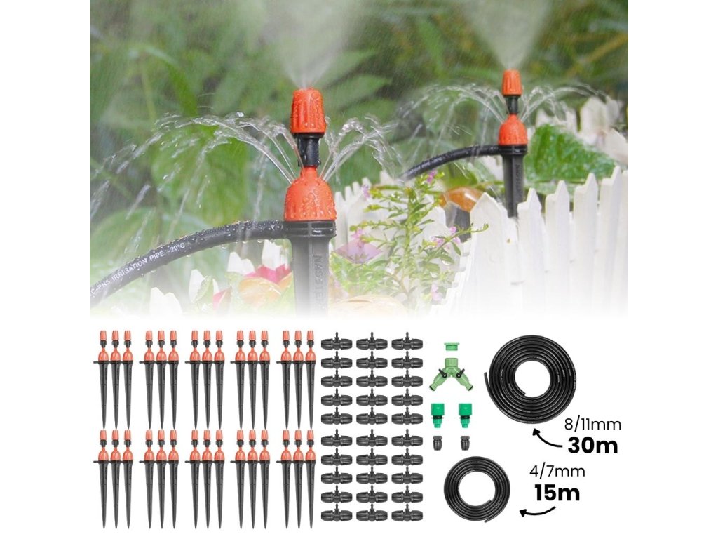 Sistemul de aspersoare pentru sol este cel mai frecvent utilizat pentru udarea gazonului, a ghivecelor și paturilor de exterior sau pur și simplu pentru udarea solului dintr-o seră. Acest kit include 30 de capete de aspersoare cu vârf dublu pentru sol, 30 m de furtun de distribuție și un total de 15 m de furtun capilar. Potrivit pentru sistemele de irigare a grădinilor primăvara și vara.