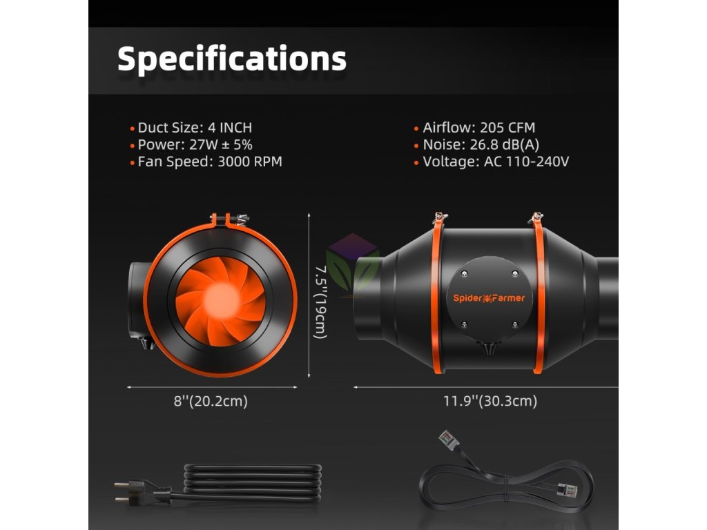 Spider Farmer 102 mm Inline ventilátor 348 m?/h, fordulatszám-szabályzó