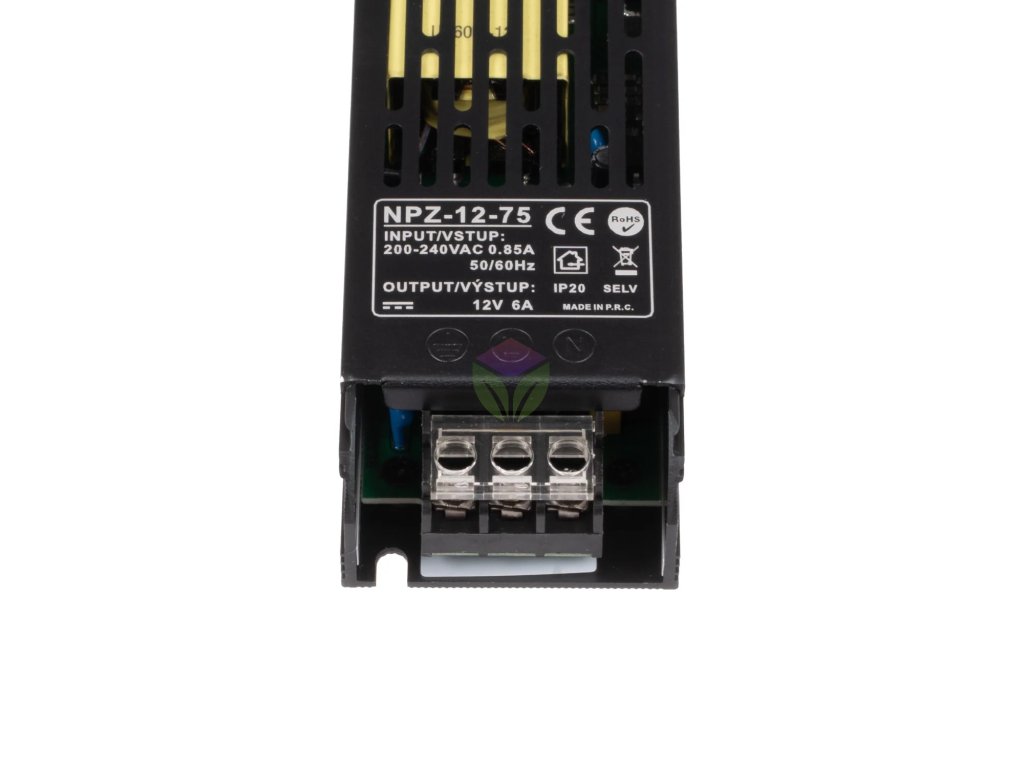 Sursă de alimentare LED pentru benzi LED (transformator) 12V 75W cu siguranțe de protecție la scurtcircuit și suprasarcină. Are reglaj manual al tensiunii de ieșire (±10%) și este potrivit pentru utilizare în interior. Se recomandă menținerea unei rezerve de sarcină pentru o durată lungă de viață.
