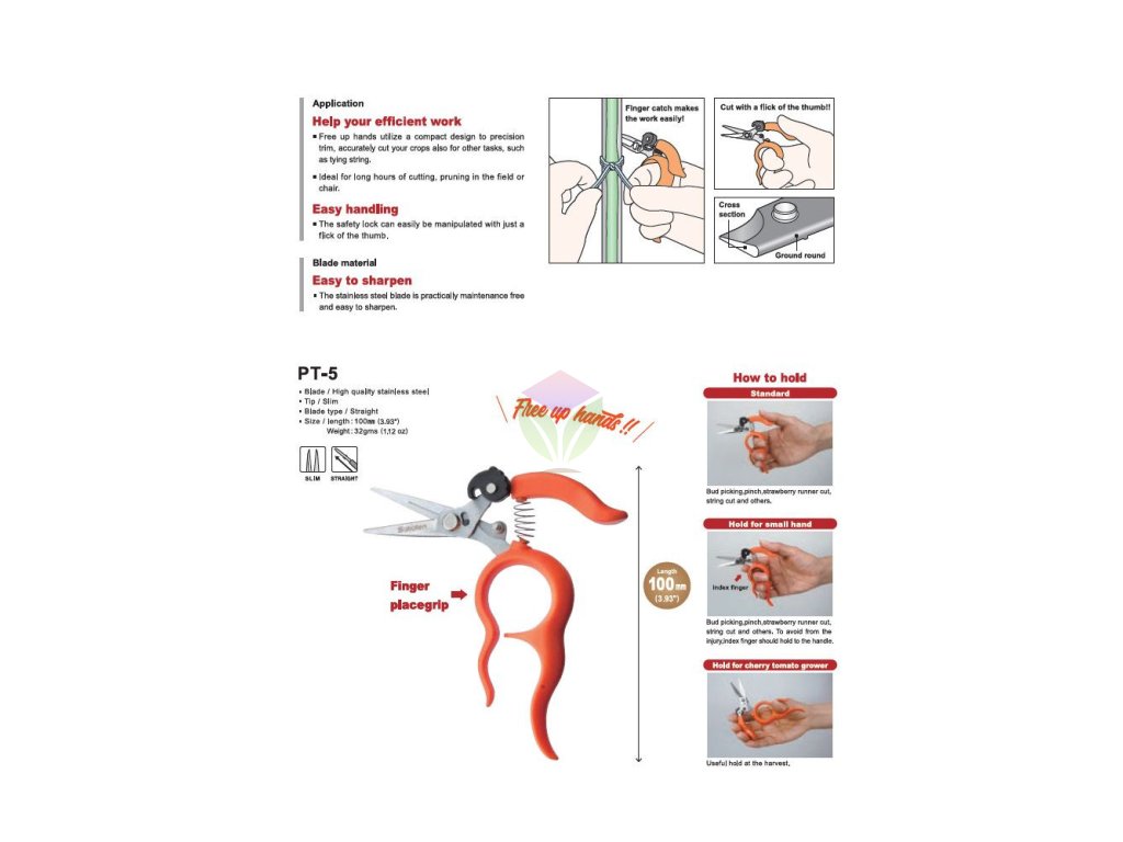 A Saboten Hands Free Secateurs apró ollói rugós és pákás kivitelben készülnek, minőségi rozsdamentes acél pengékkel. Kisebb vágási munkálatokra kiválóan alkalmasak. Hosszúsága 10 cm, súlya 32 g.