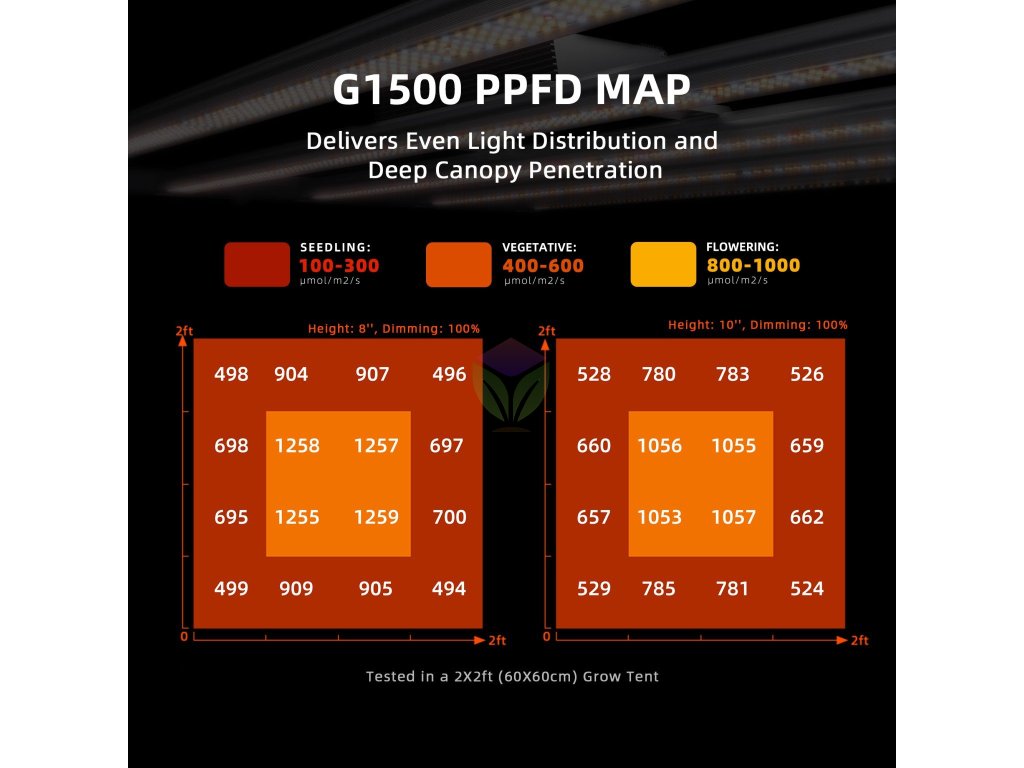 Az Spider Farmer G sorozata költséghatékony, de rendkívül hatékony választás a termesztők számára. Ez a G1500 sorozatú LED növénytermesztő panel kiemelkedő hatásfokkal rendelkezik, ami2,8umol/J és 150W maximális teljesítményű. A LED diódák magas sűrűségének köszönhetően az energia optimalizálódik, ami alacsonyabb hőtermelést és nagy teljesítményt eredményez. A fényeket egy alkalmazáson keresztül lehet vezérelni, ami lehetővé teszi a napfelkelte és naplemente szimulációját, valamint saját időzítési ütemtervek és fényerő-szintek beállítását. A fény lefedettsége 60x60 cm-től 90x90 cm-ig terjed, ami ideális 90x90 cm méretű termesztő sátrak számára.