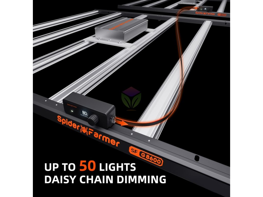 A Spider Farmer G sorozata a termesztők számára ár-érték arányban verhetetlen és rendkívül hatékony választás. Ez a LED növénytermesztő panel, a G8600-as sorozat kiváló hatékonysággal 2,85 umol/J és maximális teljesítménnyel 800W bír. Az amerikai Bridgelux márkájú nagy sűrűségű LED diódák felhasználásával az energia optimalizálásra került, ami alacsonyabb hőtermeléssel és kiváló teljesítménnyel jár. A fényeket applikációs felületen keresztül lehet vezérelni, amely lehetővé teszi a napkelte és naplemente szimulációját, valamint a saját időbeosztások és fényerő szintek beállítását. A fény által lefedett terület 120×120 cm-től 150×150 cm-ig terjed, ami ideális egy 150×150×200 cm-es termesztő sátorhoz.