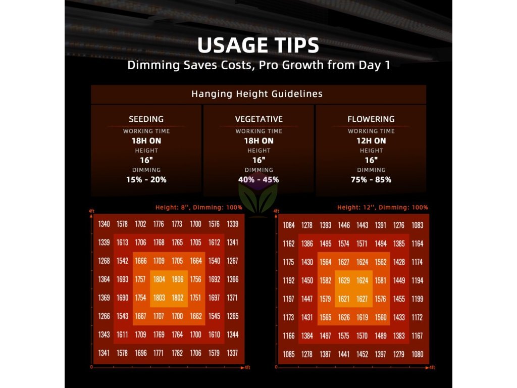 - Spektrum: 2900-3200K, 4700-5300K,650-665nm, Far-Red (700-800nm)