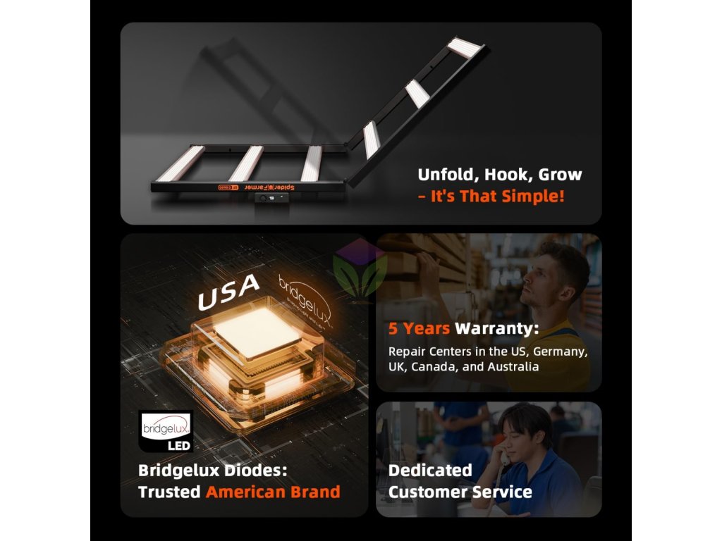 A Spider Farmer a Bridgelux LED diódáit használja, amely egy több mint 20 éves tapasztalattal rendelkező amerikai márka. Ez a technológia nagy hatékonyságot és hosszú élettartamot biztosít, a termelők pedig stabil teljesítményről számolnak be több mint 3 év használat után.