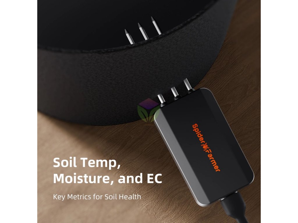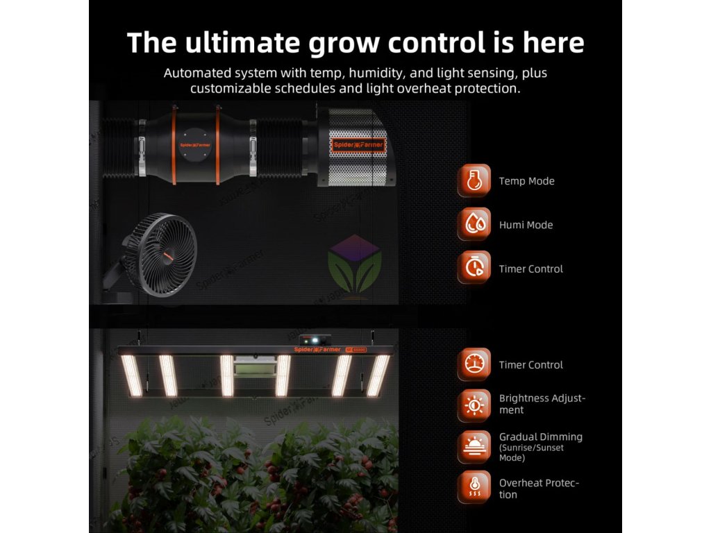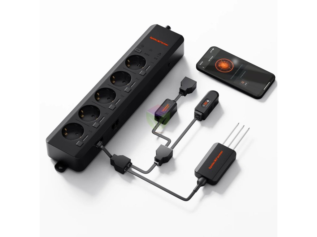 GGS AC5 5 önálló csatlakozóaljjal rendelkezik, amelyekkel akár 5 készüléket is tápellátással és irányítással lát el. A Spider Farmer alkalmazás segítségével távolról szabályozhatja az SF, G és SE sorozatú LED világítást, a RJ12 porttal rendelkező ventilátorokat és más berendezéseket. Ez a készlet támogatja az automatizálást az optimális feltételek beállításával hőmérsékletre, páratartalomra, CO2-re, és időbeosztásra. A 3 az 1-ben talajérzékelő méri a nedvesség, hőmérséklet és elektromos vezetőképesség értéket a növények egészséges növekedéséhez.