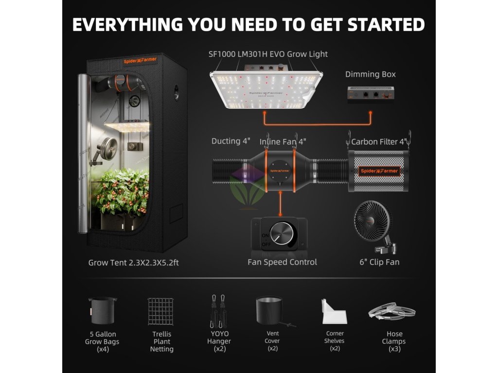 - 1× SF-1000 301H EVO Full Spectrum LED Grow Light: Ez a LED-es termesztőfény diódánként lenyűgöző 3,14 µmol/J PPE-vel büszkélkedhet.