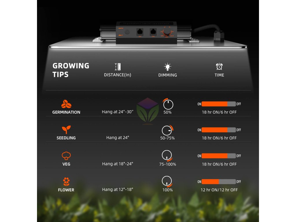 - A panel növény fölé lógó magassága a teljesítménytől függ, de a gyártó által ajánlott szabványok a következők:
